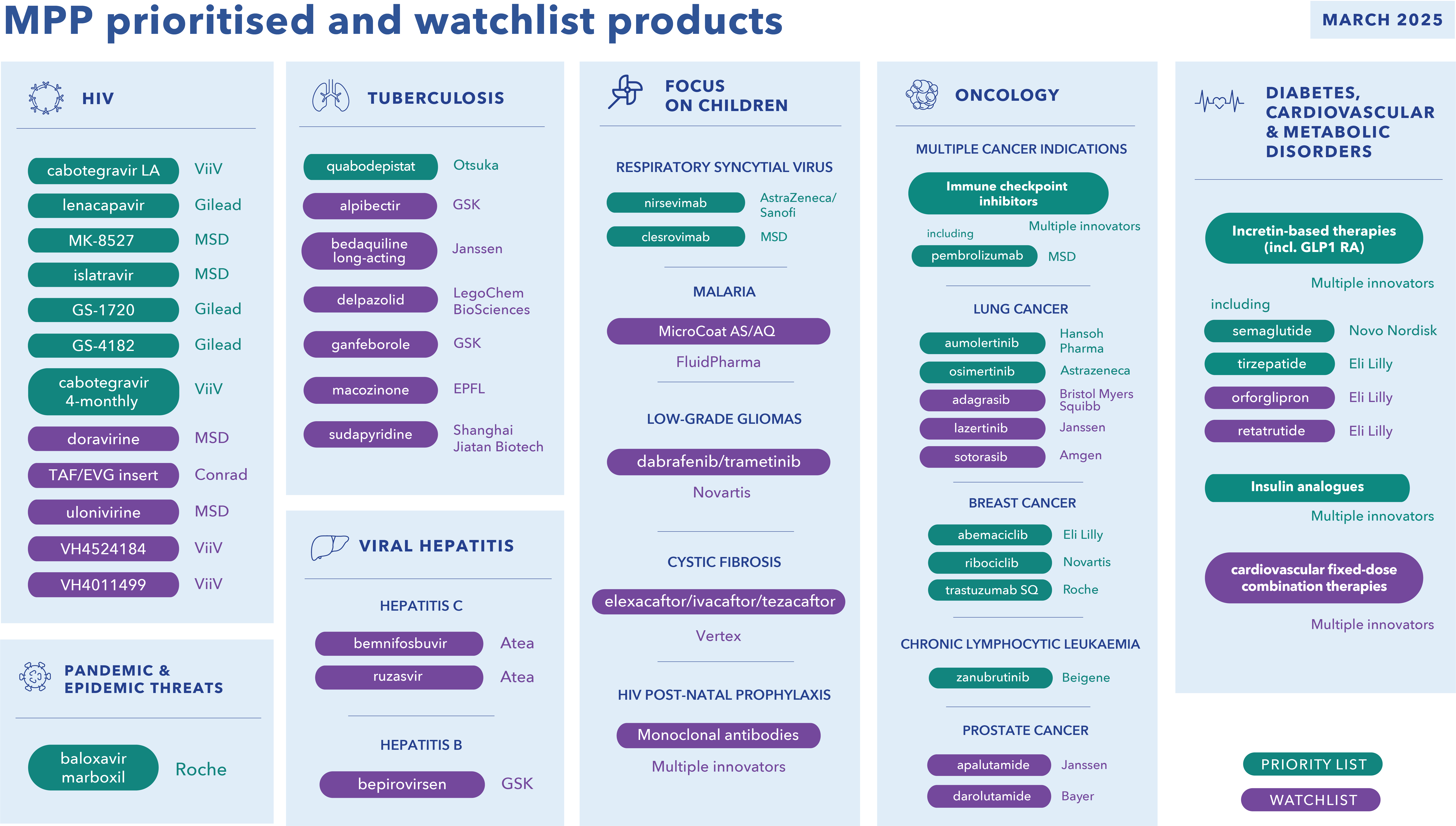 La liste de priorisation du MPP comprend des médicaments et des technologies de santé dont l’accès élargi dans les pays à revenu faible et intermédiaire (PRFI) pourrait apporter des bénéfices sanitaires significatifs par rapport aux standards de soins existants, et pour lesquels un accord volontaire, incluant des licences et/ou un transfert de technologie, via le MPP, pourrait avoir un impact substantiel sur la santé publique.