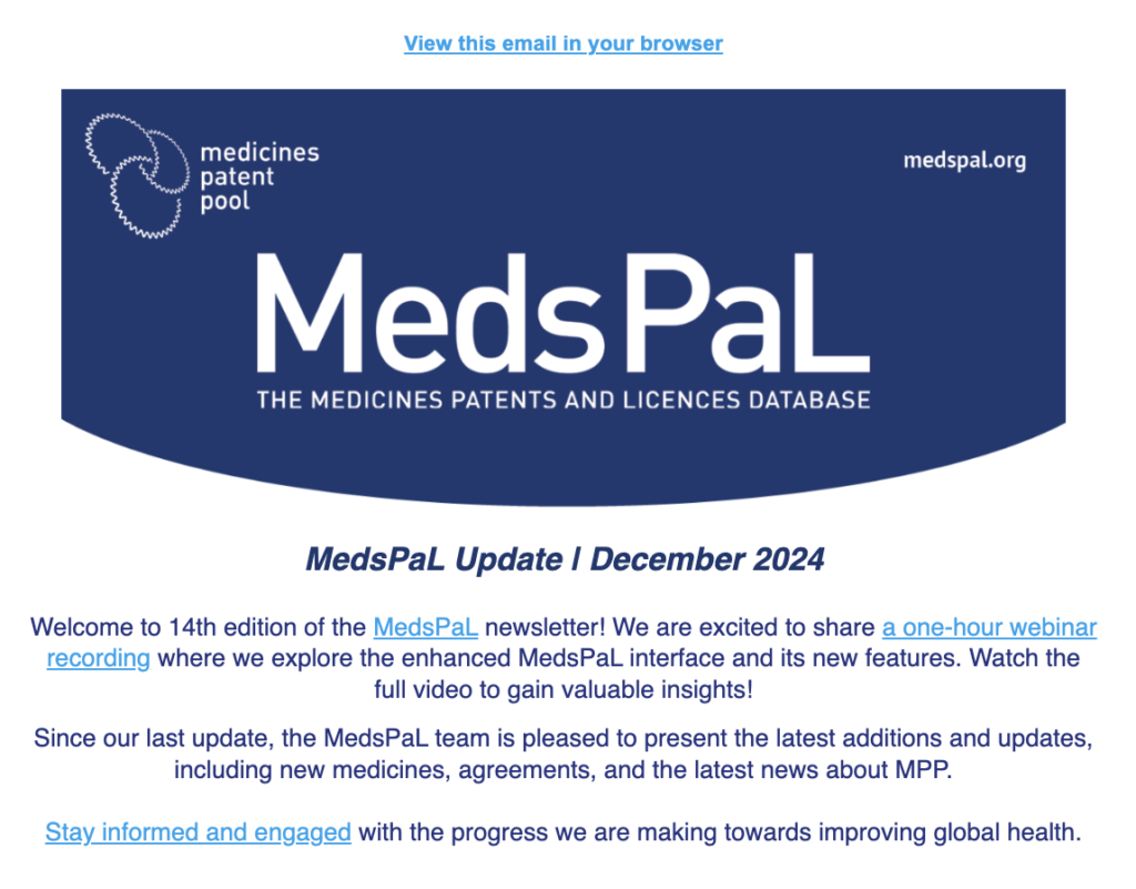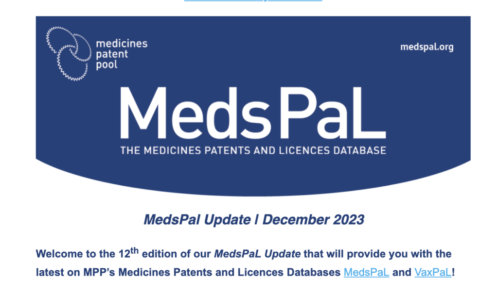 The Medicines Patent Pool’s patents and licences database MedsPaL is a free resource that provides information on the intellectual property status of key health technologies and products.